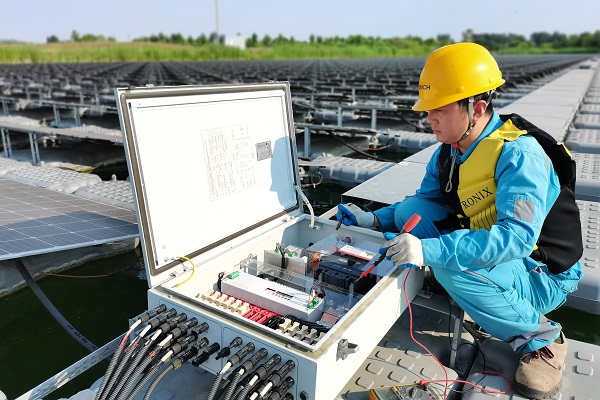 安徽宿州,海螺新能源華陽電站20區(qū)1號逆變器漂浮組件區(qū)域,運(yùn)維技術(shù)員方星正在對水面光伏匯流箱支路接地故障進(jìn)行檢查處理。(衛(wèi)任云/攝)