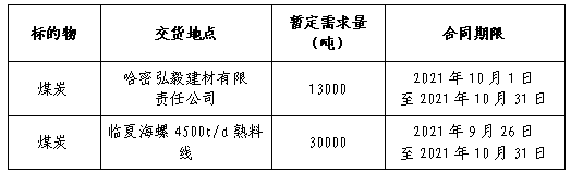為做好哈密弘毅公司及臨夏海螺10月份煤炭采購工作,滿足生產(chǎn)需要,本著“公開、公平、公正”的原則,擬對煤炭供貨進(jìn)行公開招標(biāo),現(xiàn)將招標(biāo)采購信息發(fā)布如下:
