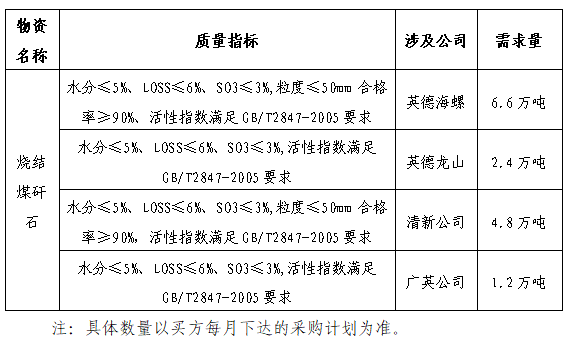 根據(jù)生產(chǎn)用料需求,擬對(duì)英德海螺、龍山、清新、廣英、陽春公司2021-2022年度高硅砂巖、含鐵粘土、燒結(jié)煤矸石進(jìn)行招標(biāo),為進(jìn)一步體現(xiàn)公平、公正、公開的原則,現(xiàn)將招標(biāo)采購信息發(fā)布如下: