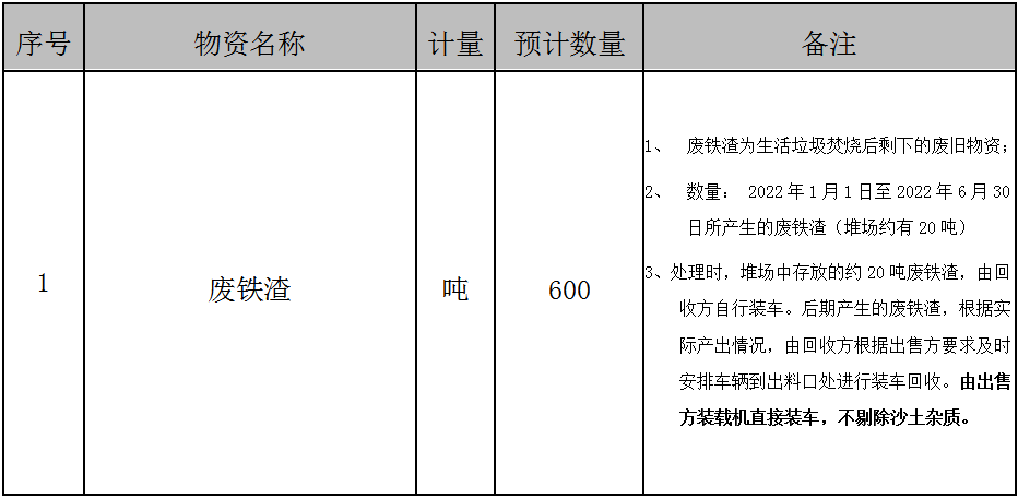 2.廢鐵渣為生活垃圾焚燒系統(tǒng)焚燒后的廢舊物資,從中標(biāo)日起截止2022年6月30日期間垃圾焚燒所產(chǎn)生的廢鐵渣,均由中標(biāo)單位根據(jù)招標(biāo)方要求分批次進(jìn)行回收,不做現(xiàn)場篩選,直接裝車過磅,所產(chǎn)生的一切費(fèi)用包含在投標(biāo)報價內(nèi)。