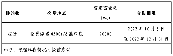 為做好我公司2022年煤炭采購(gòu)工作,滿(mǎn)足生產(chǎn)需要,本著“公開(kāi)、公平、公正”的原則,擬對(duì)煤炭直供渠道供貨進(jìn)行公開(kāi)招標(biāo),現(xiàn)將招標(biāo)采購(gòu)信息發(fā)布如下:
