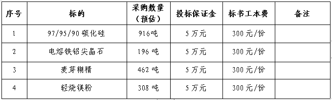 根據(jù)本公司2023年3-4季度耐火磚產(chǎn)品生產(chǎn)計(jì)劃,結(jié)合前期招標(biāo)報(bào)名情況,為確保生產(chǎn)所需原料及時(shí)采購(gòu)進(jìn)廠。現(xiàn)對(duì)碳化硅、電熔鐵鋁尖晶石、麥芽糊精、輕燒鎂粉等原材料,本著“公開(kāi)、公平、公正、透明”的原則再次公開(kāi)招標(biāo),誠(chéng)邀經(jīng)營(yíng)資質(zhì)能力較好、保供和服務(wù)能力較強(qiáng)的生產(chǎn)型企業(yè)參加投標(biāo)?,F(xiàn)就招標(biāo)相關(guān)事項(xiàng)請(qǐng)示如下: