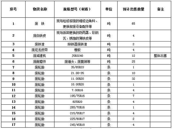 根據(jù)公司現(xiàn)場實際情況,本著“公開、公平、公正、誠實信用和競爭、擇優(yōu)”原則,濟寧海螺水泥有限責(zé)任公司擬開展廢舊物資公開招標,歡迎具備條件的單位參加,現(xiàn)將有關(guān)事項公示如下: