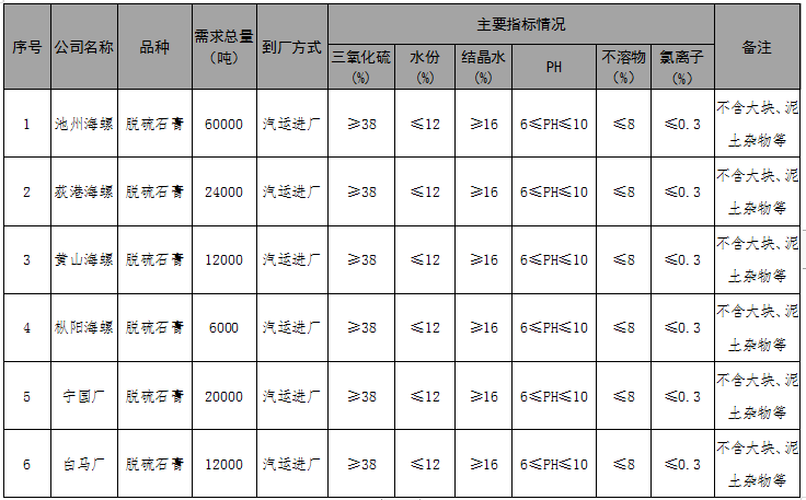 根據(jù)海螺水泥各公司生產(chǎn)需求,本著“公開、公平、公正”的原則,擬對2024年下半年脫硫石膏進(jìn)行公開招標(biāo),歡迎具備條件的單位參加,現(xiàn)將招標(biāo)相關(guān)事宜公告如下: