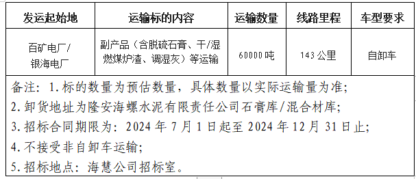 隆安海螺水泥有限責(zé)任公司擬委托安徽海慧供應(yīng)鏈科技有限公司對百礦集團(tuán)旗下百色百礦發(fā)電有限公司(以下簡稱百礦電廠)/廣西百色銀海發(fā)電有限公司(以下簡稱銀海電廠)相關(guān)副產(chǎn)品運(yùn)輸線路進(jìn)行公開招標(biāo),選定中標(biāo)人?,F(xiàn)將相關(guān)事宜公告如下: