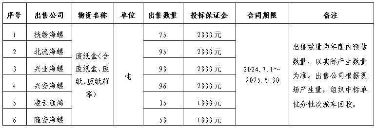 為規(guī)范區(qū)域內(nèi)各公司自動(dòng)插袋包裝機(jī)所用自動(dòng)袋外包裝紙盒(簡(jiǎn)稱:廢紙盒)、廢舊耐火磚出售管理,保證廢紙盒、廢舊耐火磚出售過(guò)程的公開、公平、公正,擬開展廣西區(qū)域2024-2025年度廢紙盒、廢舊耐火磚出售招標(biāo)工作,現(xiàn)將招標(biāo)信息公示如下: