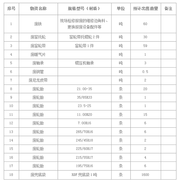 根據(jù)公司現(xiàn)場實(shí)際情況,本著“公開、公平、公正、誠實(shí)信用和競爭、擇優(yōu)”原則,濟(jì)寧海螺水泥有限責(zé)任公司擬開展廢舊物資公開招標(biāo),歡迎具備條件的單位參加,現(xiàn)將有關(guān)事項(xiàng)公示如下: