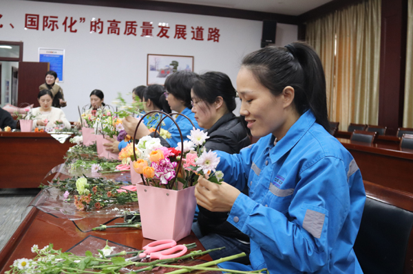 活動現(xiàn)場,花藝老師從鮮花品種、鮮花搭配和造型設(shè)計等方面進行了詳細的講解和現(xiàn)場示范。長桌上鋪滿了各色鮮花與花藝工具,嬌艷的玫瑰、靈動的洋桔梗、素雅的康乃馨……女職工們興致勃勃,邊學邊做,享受著親手創(chuàng)作的樂趣和插花藝術(shù)帶來的快樂。