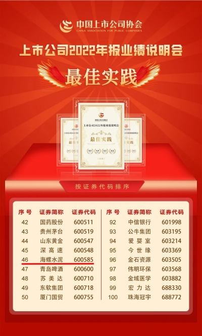 海螺水泥榮獲“上市公司2022年報(bào)業(yè)績(jī)說(shuō)明會(huì)最佳實(shí)踐”獎(jiǎng)