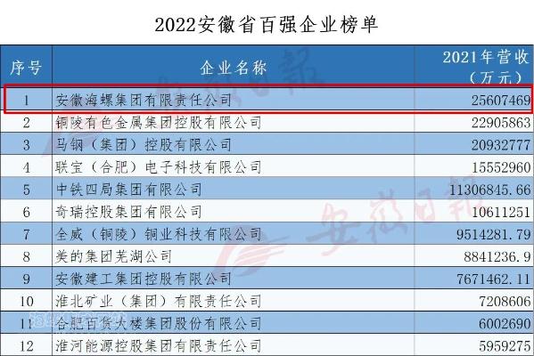 12月12日,安徽省企業(yè)聯(lián)合會(huì)、省企業(yè)家聯(lián)合會(huì)連續(xù)第18次發(fā)布“2022安徽百?gòu)?qiáng)企業(yè)”、“2022安徽制造業(yè)百?gòu)?qiáng)企業(yè)”、“2022安徽服務(wù)業(yè)百?gòu)?qiáng)企業(yè)”榜單。海螺集團(tuán)名列“2022安徽百?gòu)?qiáng)企業(yè)”、“2022安徽制造業(yè)百?gòu)?qiáng)企業(yè)”兩項(xiàng)第一。