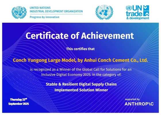近日,海螺集團(tuán)下屬“安徽海螺水泥股份有限公司——海螺云工大模型”在聯(lián)合國(guó)工業(yè)發(fā)展組織等機(jī)構(gòu)于2025年7月發(fā)起的“2025包容性數(shù)字經(jīng)濟(jì)全球解決方案征集”中,榮獲:穩(wěn)定與韌性的數(shù)字供應(yīng)鏈類(lèi)別最佳實(shí)施方案獎(jiǎng)獎(jiǎng)項(xiàng)。