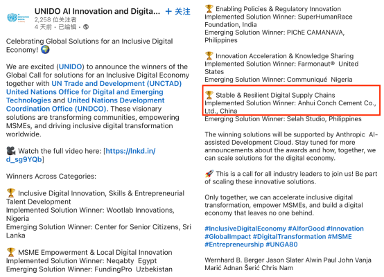 海螺榮膺聯(lián)合國(guó)《2025包容性數(shù)字經(jīng)濟(jì)全球解決方案征集》最佳實(shí)施方案獎(jiǎng)