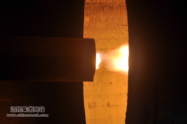 11時(shí)58分,海螺水泥總經(jīng)理助理陳永波宣布點(diǎn)火,點(diǎn)火手將火苗投入窯中,熊熊火焰瞬間噴薄而出——西巴公司1×3200t/d熟料生產(chǎn)線一次性點(diǎn)火成功!