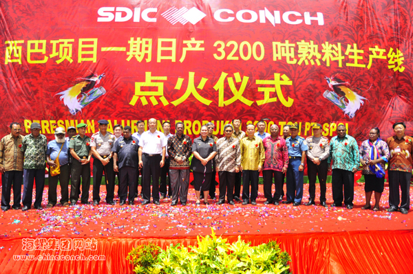 8月27日上午,項(xiàng)目現(xiàn)場(chǎng)一片喜慶升騰的氣氛,西巴公司一期3200t/d熟料生產(chǎn)線點(diǎn)火儀式在窯中廣場(chǎng)舉行。雅加達(dá)中央BKPM副主席M.M Azhar Lubis、印尼工業(yè)部總司長(zhǎng)Achmad Sigit Dwiwahjono、西巴省副省長(zhǎng)Irene manibuy、馬諾夸里縣長(zhǎng)Demas P.Mandacan以及陸軍司令、省武警總隊(duì)長(zhǎng)等政府領(lǐng)導(dǎo);國(guó)投集團(tuán)副總裁李冰、國(guó)投礦業(yè)總經(jīng)理丁后穩(wěn);海螺集團(tuán)總經(jīng)理助理、海螺水泥副總經(jīng)理丁鋒、海螺水泥總經(jīng)理助理陳永波,兄弟公司皖北區(qū)域主任周正友、印尼海螺、南加海螺總經(jīng)理吳自龍等領(lǐng)導(dǎo);參與項(xiàng)目建設(shè)的中國(guó)十七冶、中鐵十九局、邯鄲中材、中機(jī)五建、建科監(jiān)理、華申監(jiān)理、雙鳳鋼構(gòu)等單位領(lǐng)導(dǎo);西巴公司員工、當(dāng)?shù)卮迕翊砉?00余人參加了點(diǎn)火儀式。