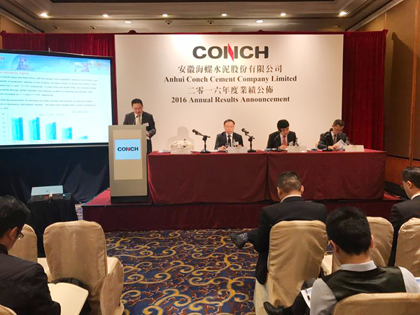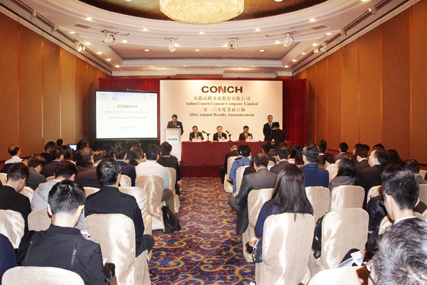 2017年3月29日上午,海螺水泥2016年度業(yè)績發(fā)布會在香港金鐘萬豪酒店舉行,公司副董事長王建超、總經(jīng)理吳斌、總會計師周波、董事會秘書楊開發(fā)出席會議,共有150余位投資者和分析師參加此次業(yè)績發(fā)布會,現(xiàn)場座無虛席,氣氛熱烈。