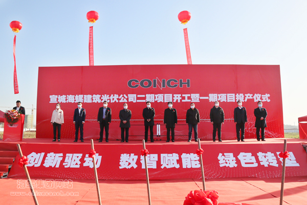 2022年12月15日,宣城海螺建筑光伏公司二期項目開工暨一期項目投產(chǎn)儀式在宣城舉行。宣城市委書記孔曉宏,市委副書記、市長何淳寬,海螺集團(tuán)黨委書記、董事長楊軍出席儀式。宣城市政府秘書長鄭華、市委副秘書長李壽生、經(jīng)開區(qū)黨工委書記黎斌,海螺水泥總經(jīng)理李群峰,海螺環(huán)??偨?jīng)理李曉波,海螺新能源總經(jīng)理馬偉,股東代表褚衍玲、徐曉華,以及宣城市直有關(guān)單位和經(jīng)開區(qū)負(fù)責(zé)人、行業(yè)嘉賓、施工單位代表參加了儀式。
