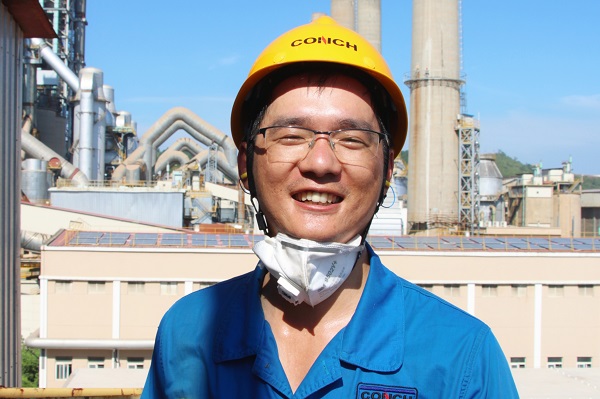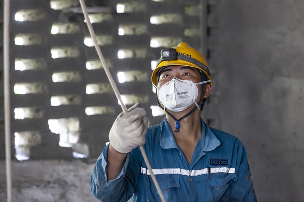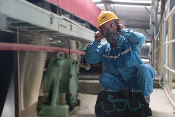 正在前往一線喂料樓的章利,勞保服已被汗水所浸透,干濕分明,手套、安全帽、勞保服在保障員工安全的同時(shí),也見證著海螺人默默的付出。(龍新陽/攝)