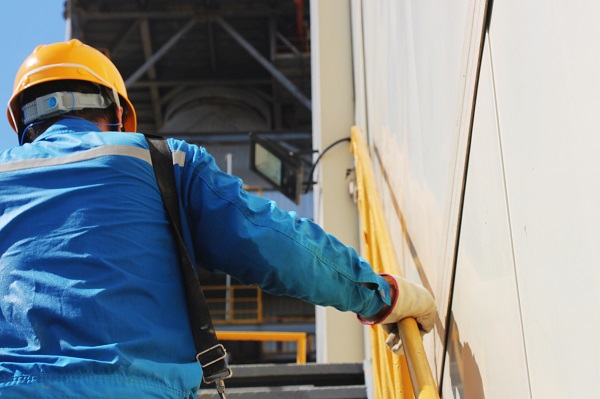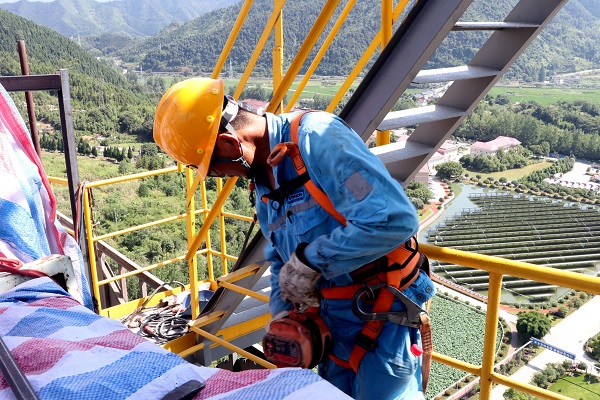 送修完成的電機(jī)送達(dá)預(yù)熱器頂,維修班長張如山正在進(jìn)行最終吊裝,高處不勝“暑”,卻難擋海螺人火熱的干勁。(王浩然/攝)