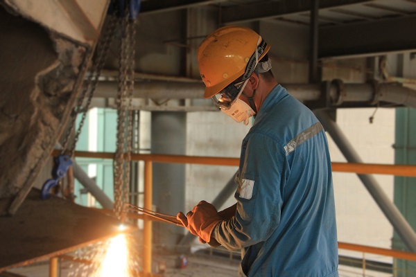 坐標(biāo)烏茲別克斯坦,卡爾希海螺的技改工作正在有序進(jìn)行中,這是水泥磨磨頭密封改造現(xiàn)場,烏籍員工加發(fā)在焊接作業(yè)中的背影。(孫艷偉/攝)