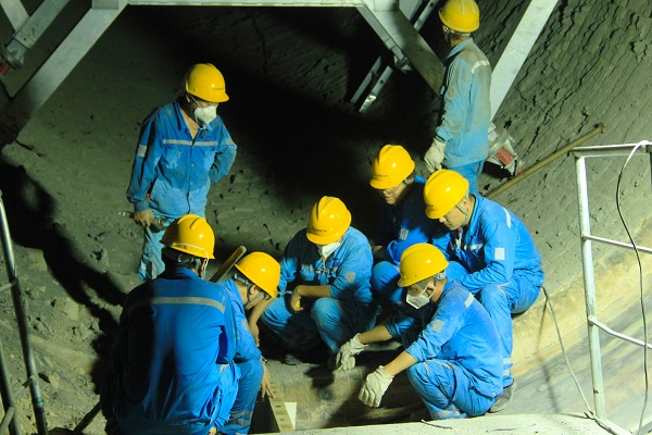 制造二分廠廠長鄭新軍正在4號窯胴體內(nèi)與施工負(fù)責(zé)人研討耐火磚砌筑方案,你一言、我一語,火熱的環(huán)境見證著海螺人火熱的激情。(王凱/攝)
