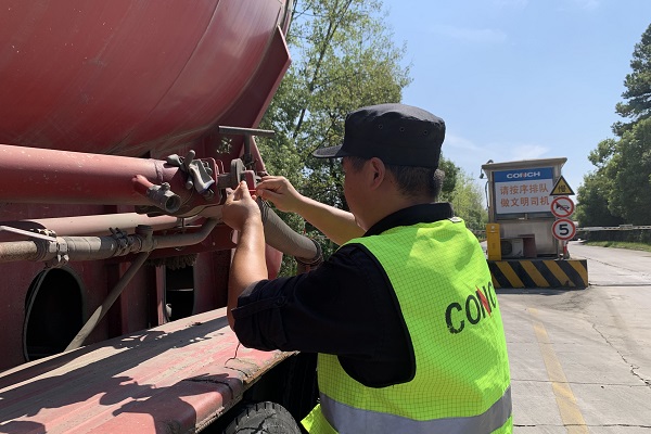 日光正盛,宣城海螺一號門外,保衛(wèi)人員陳程正在對散裝水泥出廠車輛進(jìn)行鉛封,站好崗、守好責(zé),他們是夏天的“炎值”和“門面”擔(dān)當(dāng)。(謝能/攝)