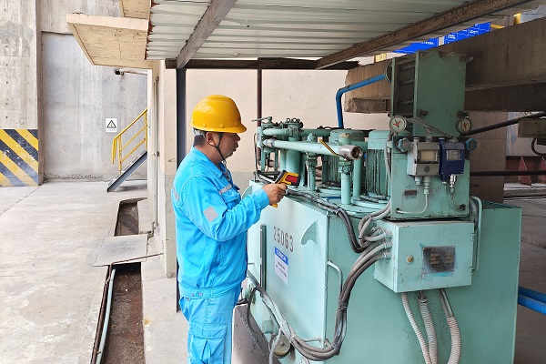 在高溫風(fēng)機(jī)油站前,制造分廠副廠長羅紅波緊盯著儀器讀數(shù),對設(shè)備運(yùn)行情況進(jìn)行逐一點(diǎn)檢。“設(shè)備‘中暑生病’,也同樣十分危險(xiǎn),點(diǎn)檢工作可馬虎不得?!绷_紅波說。(朱貴宏/攝)
