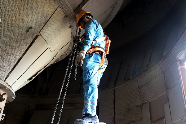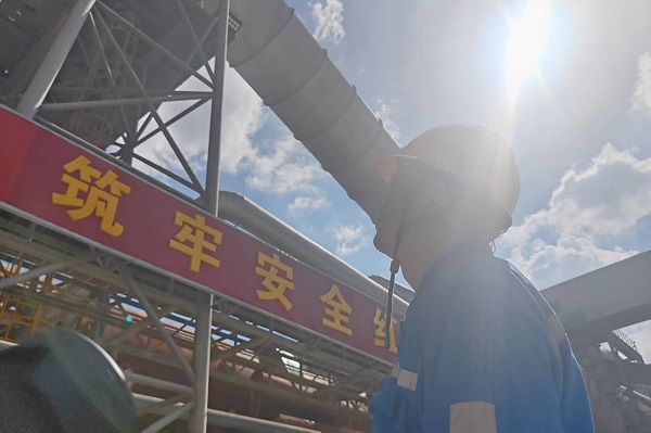 三線預(yù)熱器密尾煙室不斷往外噴涌著滾滾熱浪,身著高溫防護(hù)服的巡檢員譚平,正在對煙室內(nèi)的結(jié)皮進(jìn)行清理,保障回轉(zhuǎn)窯穩(wěn)定運(yùn)行。(秦建明/攝)