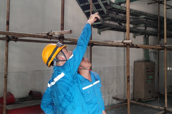 制造分廠廠長易軍和工段長周飛來到二線煤磨房現(xiàn)場查看設(shè)備狀況,他們的勞保服已經(jīng)被汗水浸透。(張洪俊/攝)