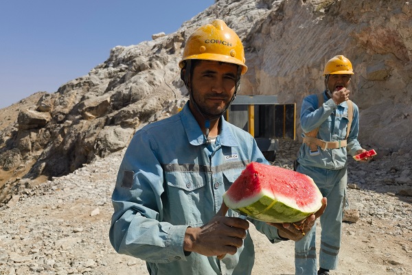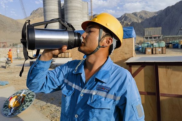 時(shí)值高溫時(shí)節(jié),中亞腹地干燥炎熱,安集延海螺的工程建設(shè)正如火如荼地進(jìn)行,一座現(xiàn)代化的水泥工廠正在拔地而起。圖為設(shè)備保全處李開留在完成總降設(shè)備安裝后,正在喝水休憩。(繆明東/攝)