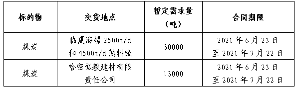 為做好臨夏海螺及哈密弘毅公司7月份煤炭采購工作,滿足生產(chǎn)需要,本著“公開、公平、公正”的原則,擬對(duì)煤炭供貨進(jìn)行公開招標(biāo),現(xiàn)將招標(biāo)采購信息發(fā)布如下: