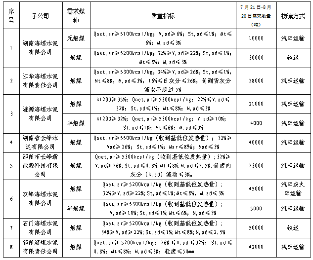 根據(jù)2021年7月21日-2021年8月20日海螺水泥湖南區(qū)域各子公司煤炭需求,現(xiàn)擬對煤炭進(jìn)行公開招標(biāo),選定中標(biāo)人,為體現(xiàn)公平、公正、公開的原則,拓寬采購渠道,現(xiàn)將招標(biāo)相關(guān)事宜公告如下: