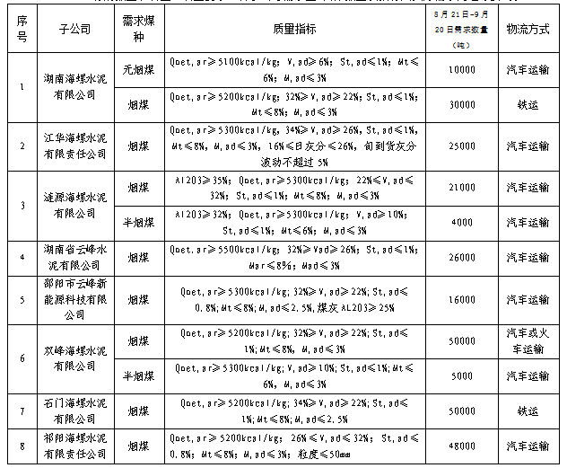 根據(jù)2021年8月21日-2021年9月20日海螺水泥湖南區(qū)域各子公司煤炭需求,現(xiàn)擬對(duì)煤炭進(jìn)行公開招標(biāo),選定中標(biāo)人,為體現(xiàn)公平、公正、公開的原則,拓寬采購(gòu)渠道,現(xiàn)將招標(biāo)相關(guān)事宜公告如下:
