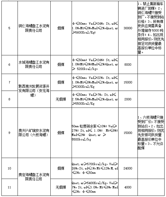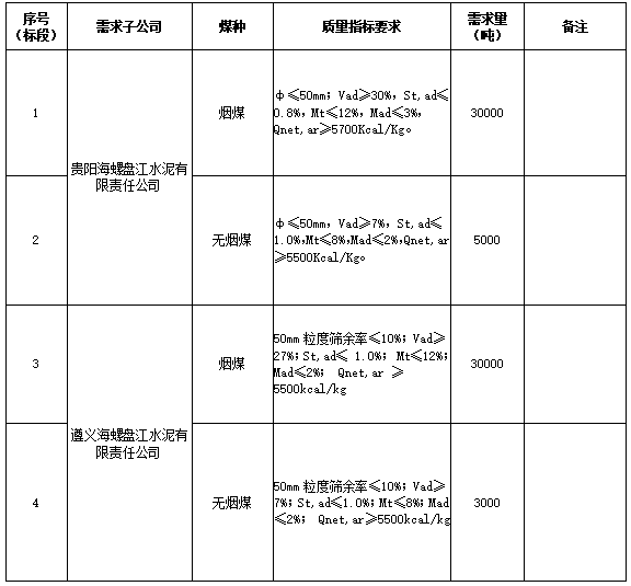 海螺水泥貴州區(qū)域擬對(duì)2021年8月21日至2021年9月20日生產(chǎn)用煤炭進(jìn)行公開招標(biāo),選定中標(biāo)單位,現(xiàn)將相關(guān)招標(biāo)事宜公示如下: