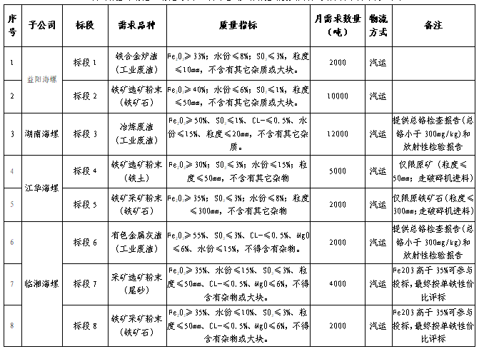 根據(jù)海螺水泥湖南區(qū)域相關(guān)子公司2021年11月-2022年4月鐵質(zhì)材料需求,擬對鐵質(zhì)材料采購進行招標(biāo),選定中標(biāo)人,為體現(xiàn)公平、公正、公開的原則,拓寬采購渠道,現(xiàn)通過海螺物資陽光采購平臺(登陸網(wǎng)址:ygcg.conch.cn)進行公開招標(biāo)。招標(biāo)相關(guān)事宜公告如下: