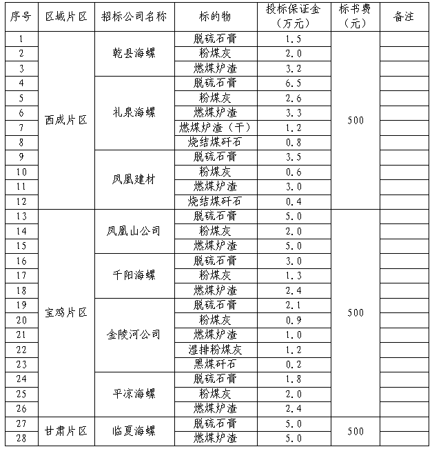 5.陜甘區(qū)域脫硫石膏不接受貨源為大唐渭河電廠、大唐西安熱電廠及黃陵電廠流通渠道投標(biāo);陜甘區(qū)域混合材不接受貨源地為麟北電廠及黃陵電廠流通渠道投標(biāo);陜甘區(qū)域粉煤灰不接受貨源地為大唐渭河電廠、照金電廠、平?jīng)鲭姀S及瑤池電廠流通渠道投標(biāo);乾縣海螺及鳳凰山公司燃煤爐渣不接受貨源地為瑤池電廠的流通渠道投標(biāo);平?jīng)龊B菝摿蚴嗖唤邮茇浽吹貫槠經(jīng)鲭姀S的流通渠道投標(biāo);金陵河公司及千陽(yáng)海螺粉煤灰不接受貨源地為大唐寶雞熱電廠的流通渠道投標(biāo)。