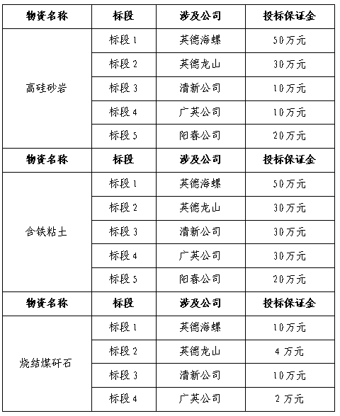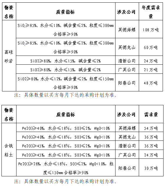 根據(jù)生產(chǎn)用料需求,擬對(duì)英德海螺、龍山、清新、廣英、陽春公司2021-2022年度高硅砂巖、含鐵粘土、燒結(jié)煤矸石進(jìn)行招標(biāo),為進(jìn)一步體現(xiàn)公平、公正、公開的原則,現(xiàn)將招標(biāo)采購信息發(fā)布如下: