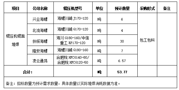 為拓寬采購渠道,提高采購質(zhì)量,本著“公開、公平、公正”的競爭原則,廣西區(qū)域六家公司(興業(yè)海螺、北流海螺、扶綏海螺、隆安海螺以及凌云通鴻)擬對2022年水泥磨輥壓機輥面堆焊進行聯(lián)合招標,選擇經(jīng)營能力較好、經(jīng)營資質(zhì)合格、保供和服務(wù)能力較強的廠家和耐磨焊絲生產(chǎn)或供應(yīng)單位,歡迎具備條件的廠家和單位參加,現(xiàn)將有關(guān)事項公示如下: