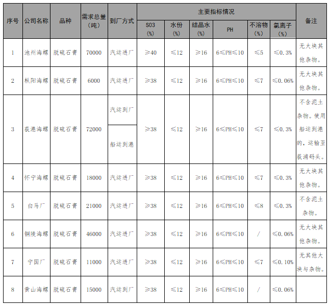 根據(jù)海螺水泥各公司生產(chǎn)需求,本著“公開、公平、公正”的原則,擬對2022年上半年脫硫石膏進行公開招標(biāo),歡迎具備條件的單位參加,現(xiàn)將招標(biāo)相關(guān)事宜公告如下: