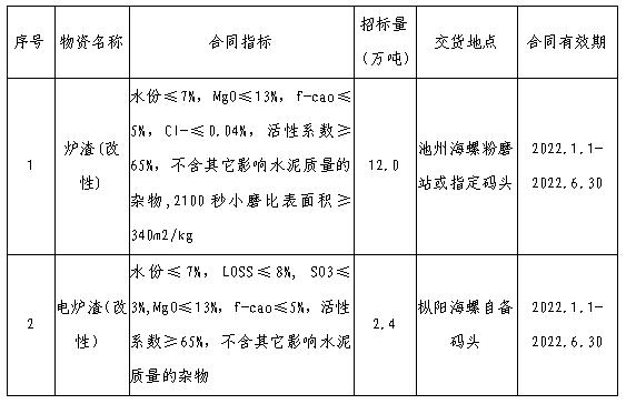 根據(jù)池州、樅陽公司水泥生產(chǎn)經(jīng)營需求,安徽池州海螺水泥股份有限公司、安徽樅陽海螺水泥股份有限公司將對2022年1月1日-2022年6月30日合同期爐渣(改性)開展采購招標(biāo)工作,為進(jìn)一步體現(xiàn)公開、公平、公正的原則,現(xiàn)將相關(guān)事宜公告如下: