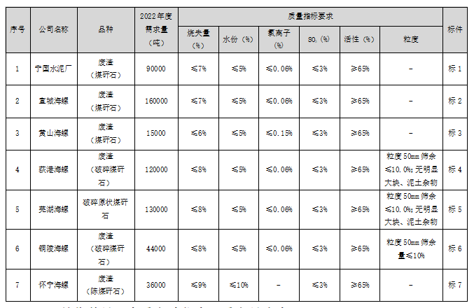 根據(jù)2022年度安徽海螺水泥股份有限公司寧國(guó)水泥廠(以下簡(jiǎn)稱:寧國(guó)水泥廠)、安徽宣城海螺水泥有限公司(以下簡(jiǎn)稱:宣城海螺)、黃山海螺水泥有限責(zé)任公司(以下簡(jiǎn)稱;黃山海螺)、安徽銅陵海螺水泥有限公司(以下簡(jiǎn)稱:銅陵海螺)、安徽荻港海螺水泥股份有限公司(以下簡(jiǎn)稱:荻港海螺)、蕪湖海螺水泥有限公司(以下簡(jiǎn)稱:蕪湖海螺)、安徽懷寧海螺水泥有限公司(以下簡(jiǎn)稱:懷寧海螺)生產(chǎn)需求,對(duì)水泥生產(chǎn)配料用煤矸石采購(gòu)進(jìn)行聯(lián)合公開招標(biāo),為體現(xiàn)公平、公正、公開的原則,同時(shí)為拓寬采購(gòu)渠道,提高采購(gòu)質(zhì)量,現(xiàn)將招標(biāo)相關(guān)事宜公告如下: