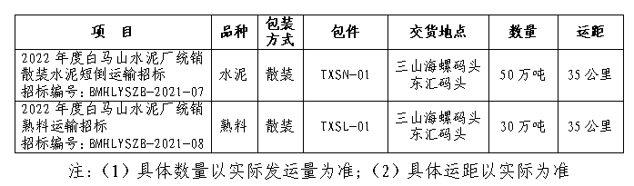 為做好2022年碼頭統(tǒng)銷散裝水泥、熟料發(fā)運工作,白馬山水泥廠擬開展發(fā)往蕪湖三山海螺港務有限公司(簡稱:三山海螺碼頭)及蕪湖東匯港務有限公司(簡稱:東匯碼頭)二家碼頭散裝水泥、熟料運輸招標。此次運輸招標本著“公開、公平、公正”的競爭原則,選擇具備經(jīng)營能力較好、運輸資質(zhì)合格、保供和服務能力較強的中間運輸保供單位,歡迎具備條件的運輸單位參加,現(xiàn)將有關(guān)事項公示如下: