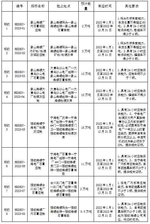 2、本次招標活動要求投標單位具有24小時運輸保供能力,在以往運輸過程中無不良記錄。投標運輸單位必須列出用于標的原材料品種運輸?shù)能囕v明細及載重噸位,且投標單位列出的運輸車輛不得與其他投標單位重復,招標人有權(quán)要求投標單位對其填報的運輸工具事實予以進一步澄清,否則取消其投標資格。