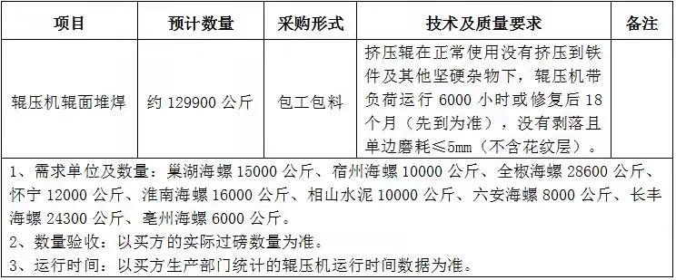 根據(jù)生產(chǎn)經(jīng)營需求,本著“公開、公平、公正、誠實(shí)信用和競爭、擇優(yōu)”原則,海螺水泥皖北區(qū)域下屬宿州海螺、全椒海螺、巢湖海螺、懷寧海螺、淮北相山、淮南海螺、六安海螺、長豐海螺、亳州海螺等九家公司擬聯(lián)合開展2021年皖北區(qū)域輥壓機(jī)輥面堆焊包工包料業(yè)務(wù)公開招標(biāo),歡迎具備條件的單位參加,現(xiàn)將招標(biāo)相關(guān)事項(xiàng)公示如下: