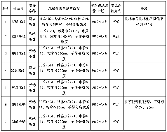 根據(jù)2022年上半年海螺水泥湖南區(qū)域各子公司天然石膏類需求,現(xiàn)組織天然石膏招標(biāo),本次招標(biāo)秉承公平、公正、公開的原則,具體事宜如下: