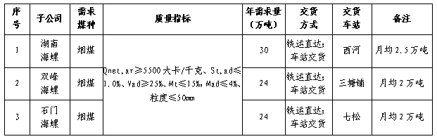 根據(jù)2022年海螺水泥湖南區(qū)域湖南海螺水泥有限公司(以下,簡稱“湖南海螺”)、雙峰海螺水泥有限公司(以下,簡稱“雙峰海螺”)、石門海螺水泥有限責任公司(以下,簡稱“石門海螺”)三家子公司的鐵路直供煤炭需求,現(xiàn)海螺水泥湖南區(qū)域煤炭招標小組擬對湖南區(qū)域2022年鐵路直供煤炭進行網(wǎng)上公開招標,以選定中標人。本次招標由湖南海螺牽頭組織,為拓寬采購渠道,同時體現(xiàn)公平、公正、公開原則,現(xiàn)將招標相關(guān)事宜公告如下:
