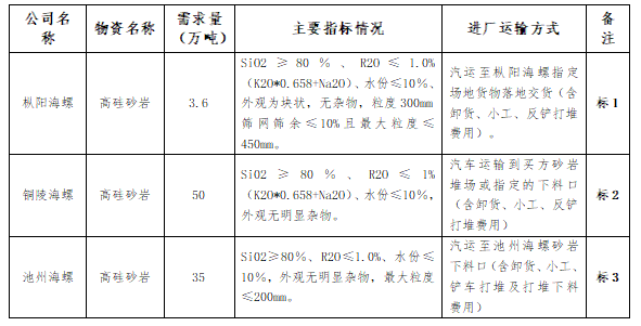 根據(jù)池州、銅陵和樅陽(yáng)海螺公司實(shí)際生產(chǎn)需求,本著“公開(kāi)、公平、公正”的原則,擬對(duì)直供高硅砂巖進(jìn)行公開(kāi)招標(biāo),歡迎具備條件的單位參加,現(xiàn)將招標(biāo)相關(guān)事宜公告如下: