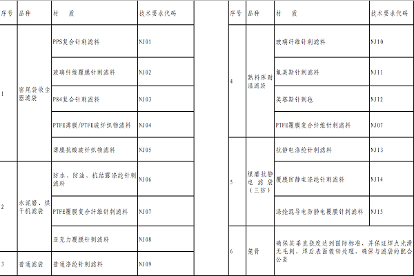 1.3使用壽命要求:窯尾耐高溫濾袋要求國產(chǎn)濾料不低于3年,進(jìn)口濾料不低于5年(要求提供保證措施),煤磨濾袋不低于2年,普通濾袋、熟料庫耐溫袋不低于1年,水泥磨濾袋不低于1.5年,投標(biāo)方在投標(biāo)時必須列明具體保證壽命。