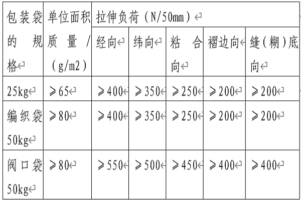 生產(chǎn)的包裝袋必須滿足GB9774-2010《水泥包裝袋》、GB/T8946-2013《塑料編織袋通用技術(shù)要求》標(biāo)準(zhǔn)要求。