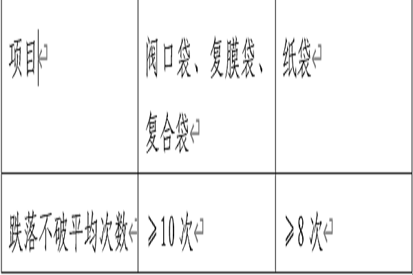 任取五個樣袋按規(guī)定熱處理(除紙袋外)后以跌落試驗不破損次數(shù)表示,要求不低于見表2規(guī)定。