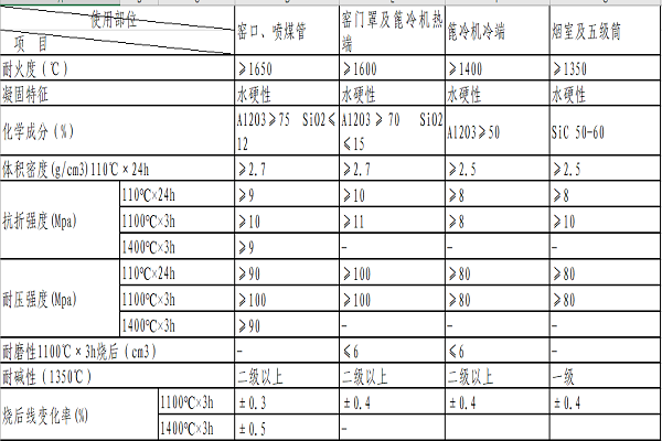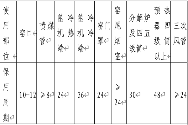 3、性能保證:在需方正常操作情況下,窯運轉(zhuǎn)率≥70%,各種澆注料按使用部位需滿足如下的最短使用周期: